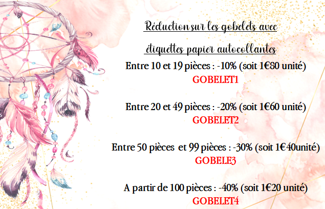 Attention : les gobelets sont ré-utilisables. Toutefois, les étiquettes ne doivent pas être au contact d'un liquide (eau). Il est recommandé de commander ces gobelets uniquement dans le but d'un usage éphémère (lors d'un événement : baptême, communion, etc...)
